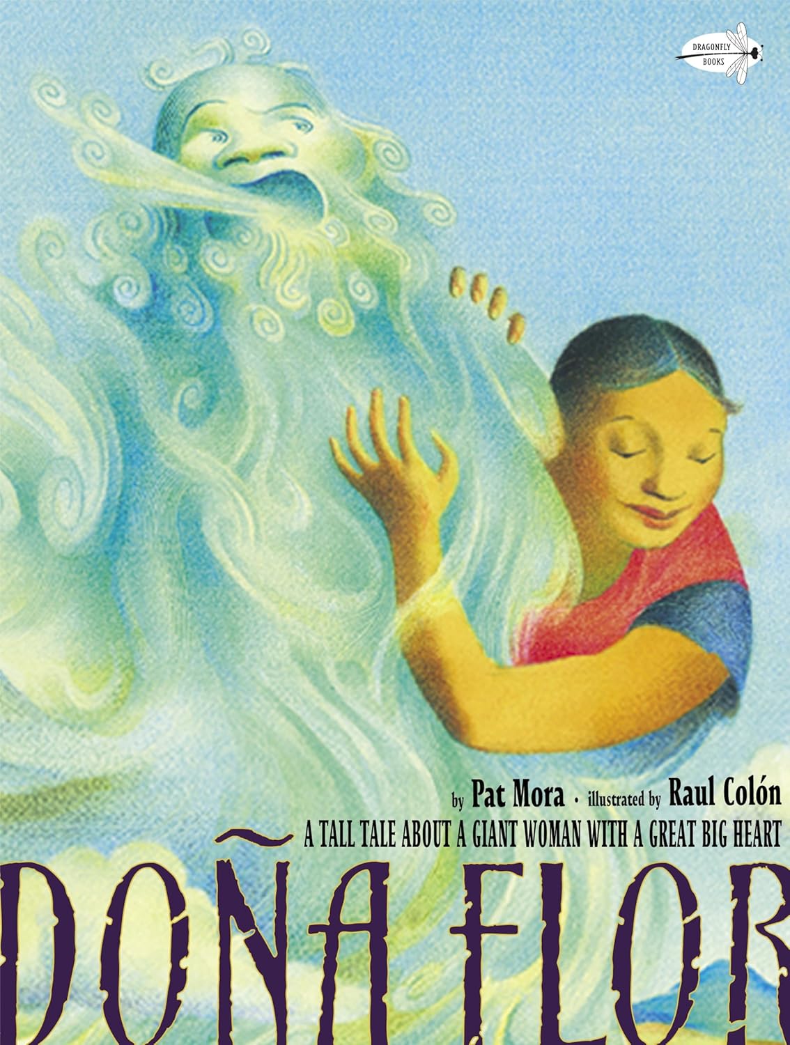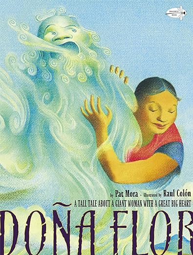 Doña Flor is a giant lady who lives in a tiny village in the American Southwest. Popular with her neighbors, she lets the children use her flowers as trumpets and her leftover tortillas as rafts. Flor loves to read, too, and she can often be found reading aloud to the children. One day, all the villagers hear a terrifying noise: it sounds like a huge animal bellowing just outside their village. Everyone is afraid, but not Flor. She wants to protect her beloved neighbors, so with the help of her animal friends, she sets off for the highest mesa to find the creature. Soon enough, though, the joke is on Flor and her friends, who come to rescue her, as she discovers the small secret behind that great big noise.The creators of Tomás and the Library Lady, Pat Mora and Raul Colón, have once again joined together. This time they present a heartwarming and humorous original tall tale—peppered with Spanish words and phrases—about a giant lady with a great big heart.