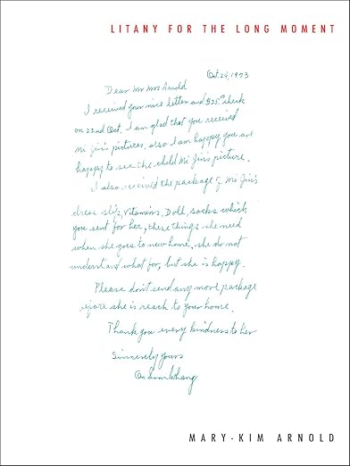 Literary Nonfiction. Asian & Asian American Studies. The orphan at the center of LITANY FOR THE LONG MOMENT is without homeland and without language. In three linked lyric essays, Arnold attempts to claim her own linguistic, cultural, and aesthetic lineage. Born in Korea and adopted to the US as a child, she explores the interconnectedness of language and identity through the lens of migration and cultural rupture. Invoking artists, writers, and thinkers—Theresa Hak Kyung Cha, Francesca Woodman, Susan Sontag, among others—LITANY FOR THE LONG MOMENT interweaves personal documents, images, and critical texts as a means to examine loss and longing.