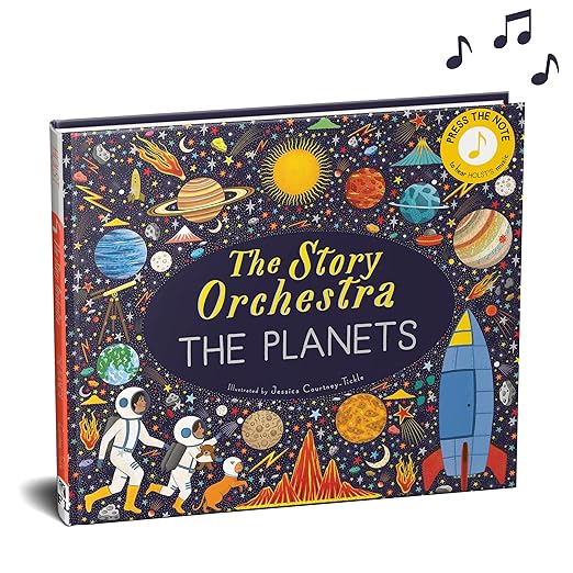 *GOOD HOUSEKEEPING BEST KIDS BOOK AWARD 2023 WINNER* Discover the spellbinding magic of The Planets in this musical reimagining of one of Holst’s most famous suites.Push the button on each beautiful scene to hear the vivid sound of an orchestra playing from Holst’s score. This tale is about a brother and sister who adventure deep into our solar system. Our story begins one night as Helen and Tim get ready for bed in their new space rocket bunk beds… but sleep will have to wait as they magically blast up, up, up into the glittering night sky, leaving planet Earth far below them. Helen and Tim journey here, there and everywhere through our majestic solar system. They soar past the cold rocky surface of Mars as it rises into towering peaks and plunges into deep canyons and glide through a bumpy asteroid belt made of icy rocks. They blast deeper into our solar system, exploring the dazzling stars and astounding planets along the way. But now it really is time to head home! As the rocket speeds towards Earth, Tim and Helen watch the sun rise over their planet. As you and your little one journey through the magical scenes, you will press the buttons to hear 10 excerpts from the score. Readers should press firmly on the pages to activate the sounds, encouraging interactive learning and introducing children to this beautiful piece of music. At the back of the book, find a short biography of the composer, Gustav Holst, with details about his composition of The Planets. Next to this, you can replay the musical excerpts and, for each of them, read a discussion of the instruments, rhythms and musical techniques that make them so powerful. A glossary defines musical terms.The Story Orchestra series brings classical music to life for children through gorgeously illustrated retellings of classic ballet, opera and program music stories paired with 10-second sound clips of orchestras playing from their musical scores.Also available from the Story Orchestra series: Four Seasons in One Day, The Nutcracker, The Sleeping Beauty, Swan Lake, Carnival of the Animals, The Magic Flute, In the Hall of the Mountain King and I Can Play (vol 1).Manufacturer’s note: please pull the white tab out of the back of the book before use. Sound buttons require a firm push in exact location to work, which may be hard for young children. All sound clips are 10 seconds long.The perfect primer to introduce children to classical music.